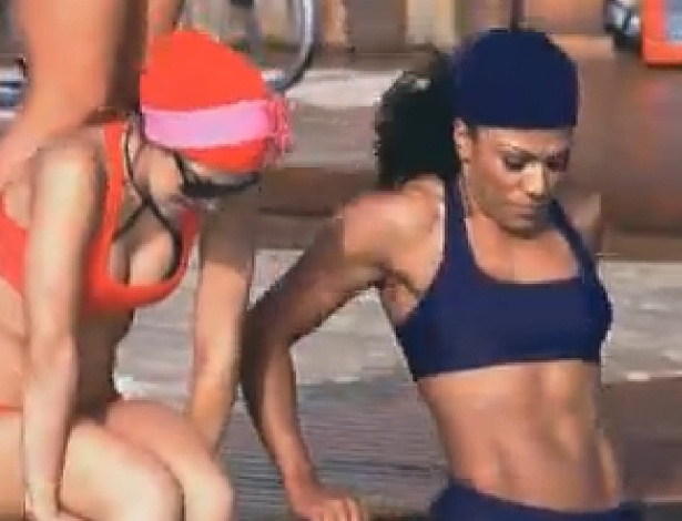 - Shayene Cesário coloca touca de natação para disputar prova (23/6/12) Reprodução/Record Mais