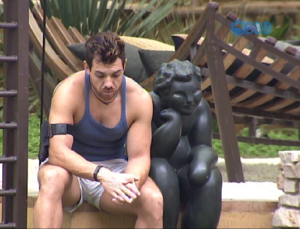 30.mar.2015 - Um dos emparedados da semana, ao lado de Adrilles, Cézar acorda e vai direto para a área externa da casa. Primeiro, ele se ajoelha ao lado da famosa estátua do jardim e faz uma oração. Depois, senta ao lado dela e fica pensativo Reprodução/TV Globo Mais